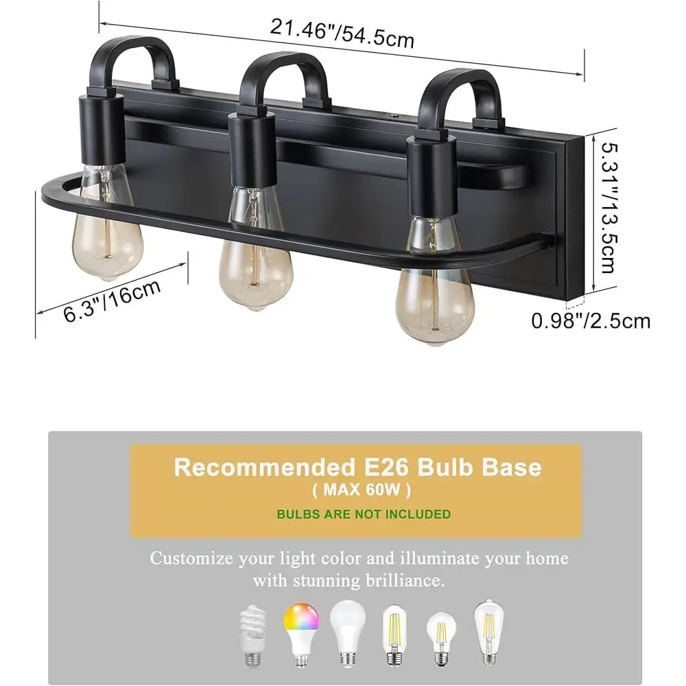 About this item Enhance Your Space with Unique Industrial Design: Our 3-light bathroom lighting fixture features a modern industrial look and adds a touch of class and elegance to any interior, making it perfect for living rooms, bedrooms, kitchens, porches, bathroom vanities, and other areas that require stylish decoration. Dimensions for Easy Integration: The fixture has a length of 21. 46 inches (54. 5cm) and a height of 7. 48 inches (19cm), with a plate size of 21. 6* 5. 31*0. 98inches (54. 5*13. 5*2. 5cm). Please carefully check the dimensions before purchasing to ensure that this wall light fixture fits your room seamlessly. Versatile Bulb Compatibility for Personalized Lighting: Our farmhouse vanity light requires 3 E26 base bulbs. It is compatible with all types of bulbs, including incandescent, LED, CFL, halogen, and other bulbs with a standard E26 base. (Bulbs are NOT included. ) When used with a dimmable bulb and compatible dimmer switch, this rustic bathroom light fixture can be dimmed to create the desired ambiance. Quick & Easy Installation: Our bathroom lighting package includes all the necessary mounting hardware and instructions for quick and hassle-free installation. It requires hardwiring and does not come with an on/off switch or plug-in cord. Rest assured that the hardwired sockets are built with premium materials and circuitry, ensuring durability and safety during use. Reliable After-Sales Service: At LMSOD, we're dedicated to providing you with the best customer experience. This bathroom lighting fixture comes with comprehensive after-sales support. If you have any concerns or suggestions, we're always here to help.