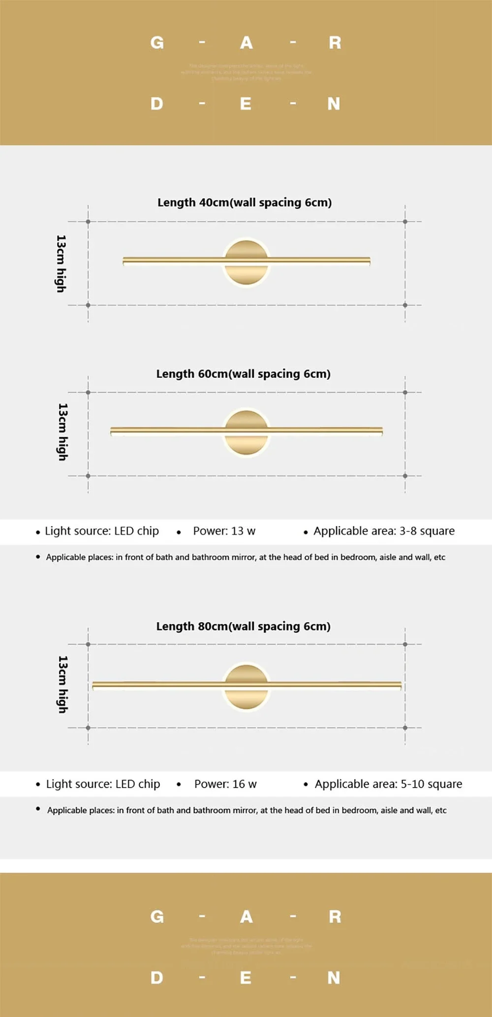 Product Information Product Type:Wall lamp Is Smart Device: No Product Color:Black,Gold Size:L40cm/60cm/80cm H13cm wall spadng 6cm Voltage:90-260V Wattage:10W-17W Material:Iron/Aluminum Lighting... Read more